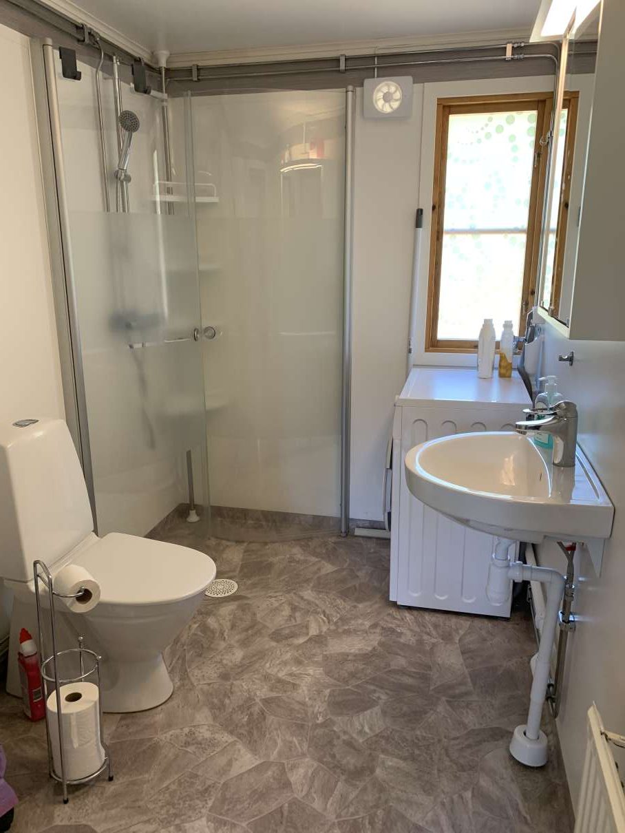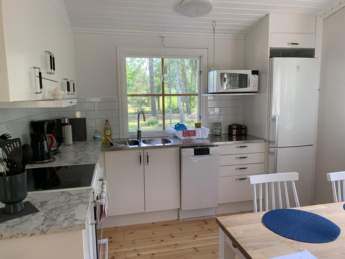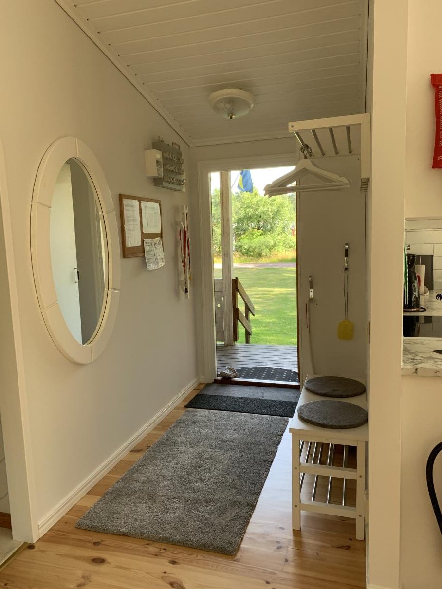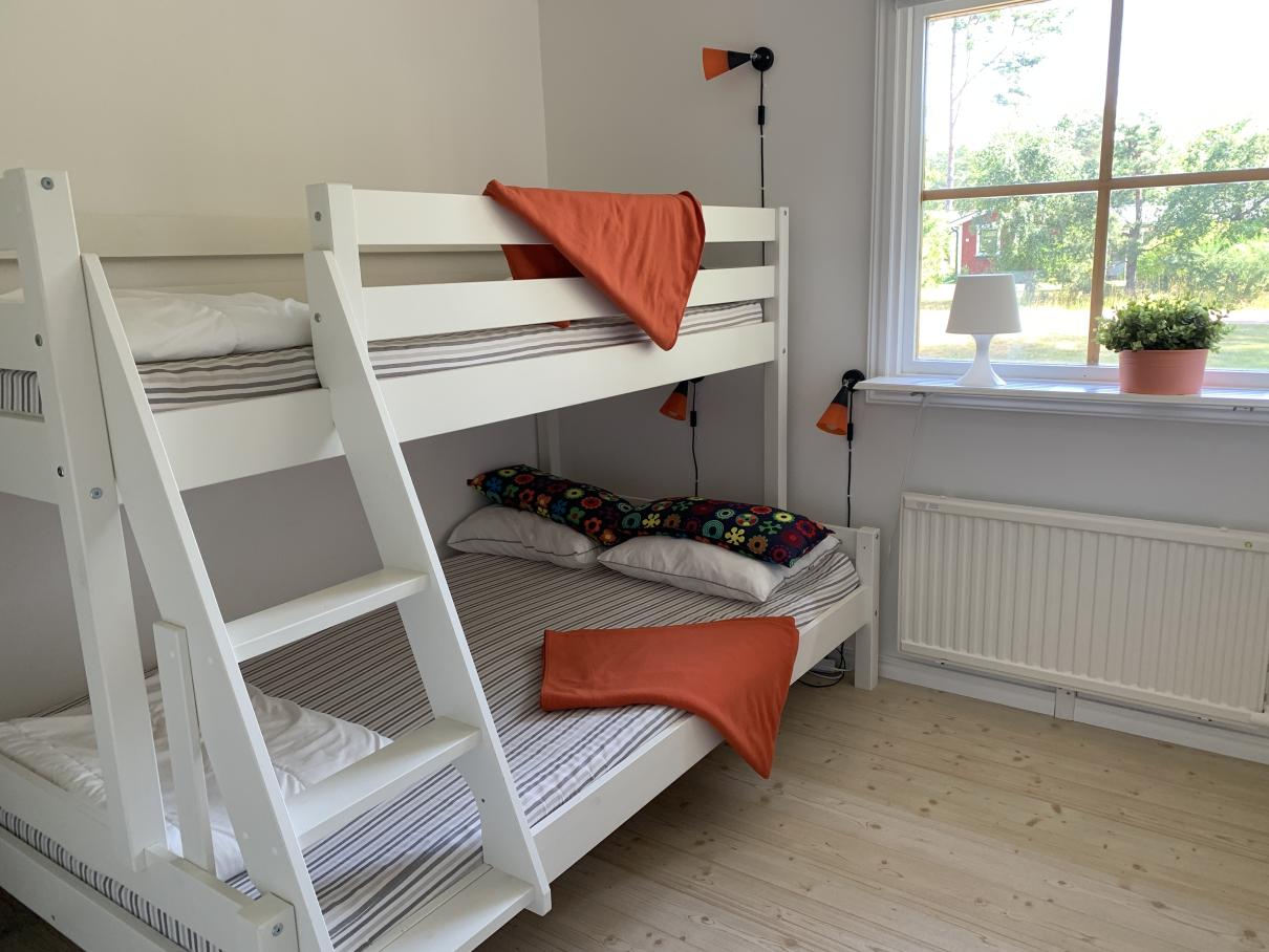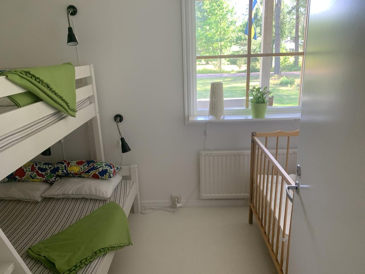 Allrummets sittmöbelEn enkel hörnsoffa sitter man skönt i om kvällarna. Köket har diskmaskin och microEtt kök med alla bekvämligheter. Porslin glas bestick grytor pannor m.m Allrum med kökAC aggregatet hänger straxt över köksfönstret. Den här enheten håller både skön värme och kyla i huset. DubbelsängDubbelsäng 160cm medelmjuk resårmadrass. Våningssäng & SpjälsängVåningssängens bredd i botten 120cm och överslaf 90cm. VåningssängSängens bredd i botten 120cm och överslaf 90cm. HallStädskåp klädhängare spegel Toalett med dusch och tvättmaskinHär är också senaste standard